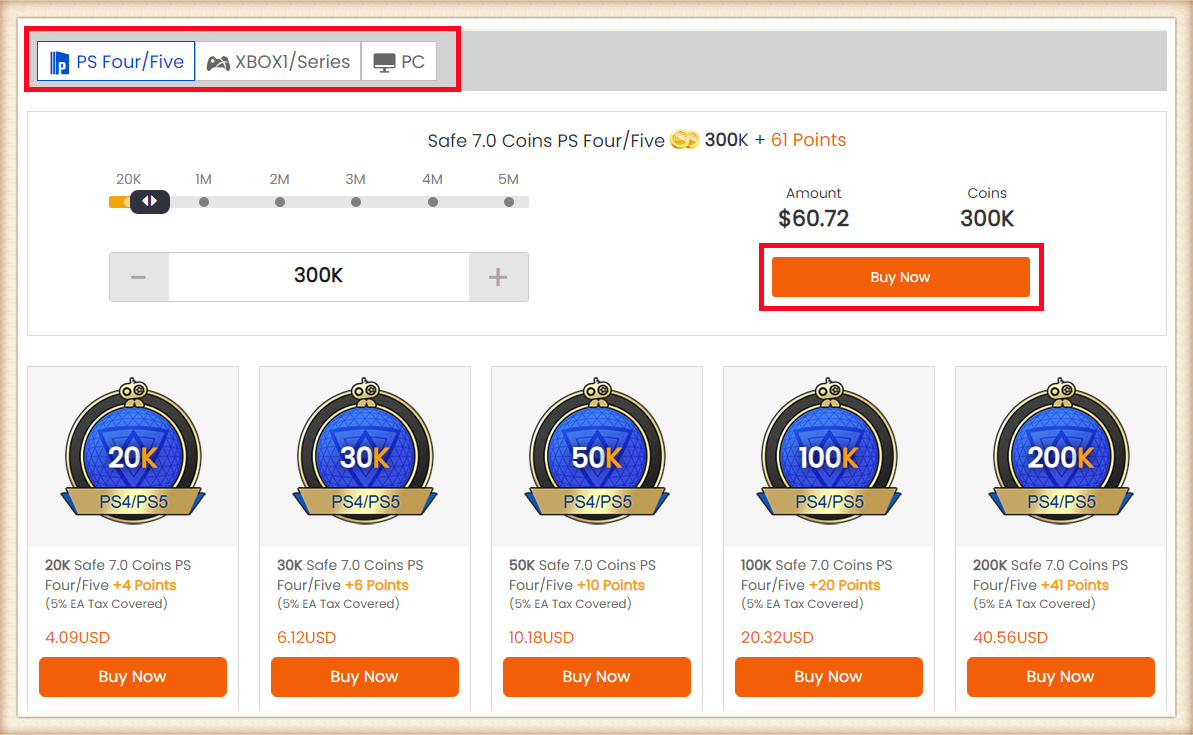 2. Select your console, then enter or select the coins amount you want to buy, and click "BUY NOW".