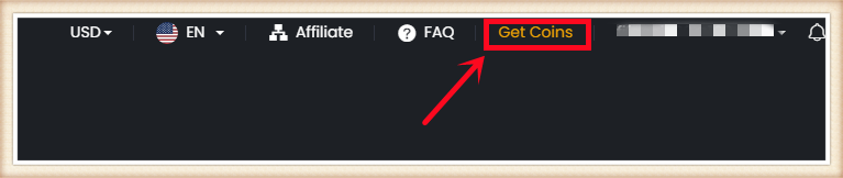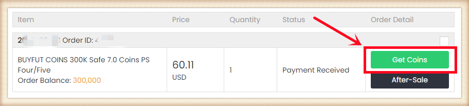 4. Click "Get Coins" at the top right, find your order, and click "Get Coins".